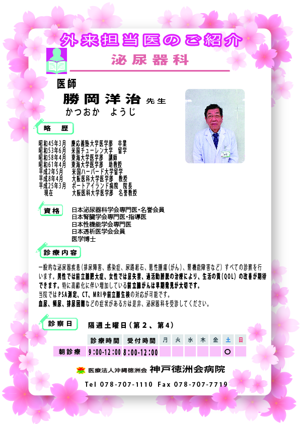 泌尿器科外来開始について 2020.03.13 2020年3月泌尿器科 勝岡洋治医師 入職にともない、隔週土曜日(第2.第4)に泌尿器科外来を開始します。 診察日の詳細は、外来診療担当表 泌尿器科の詳細は、泌尿器科 まで