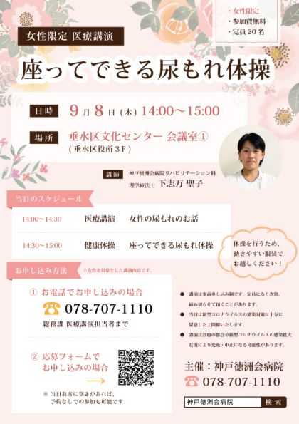 9月医療講演①「座ってできる尿もれ体操」 2022.07.08 参加お申し込みはお電話(078-707-1110 医療講演担当者まで)またはこちらからお願いします。 ※女性を対象とした講演内容です。PDFはこちら