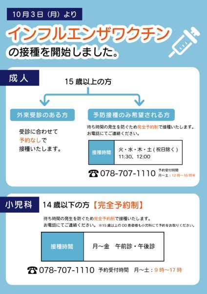 10/3(月)〜よりインフルエンザワクチンの接種を開始します。