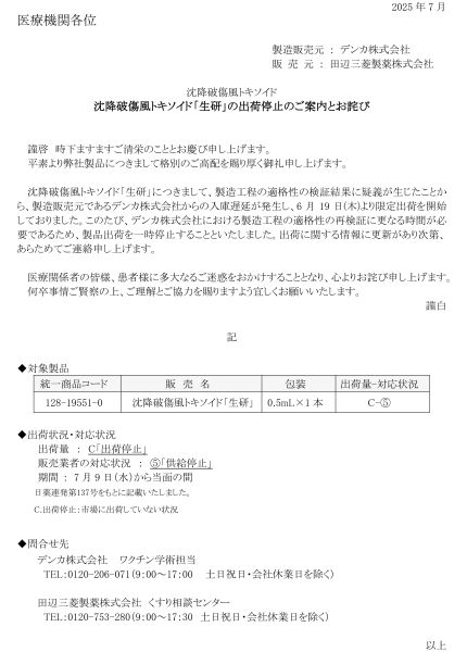 令和7年7月9日に破傷風トキソイドの出荷停止・供給停止が発表され、全国的に入手が困難な状況となっております。